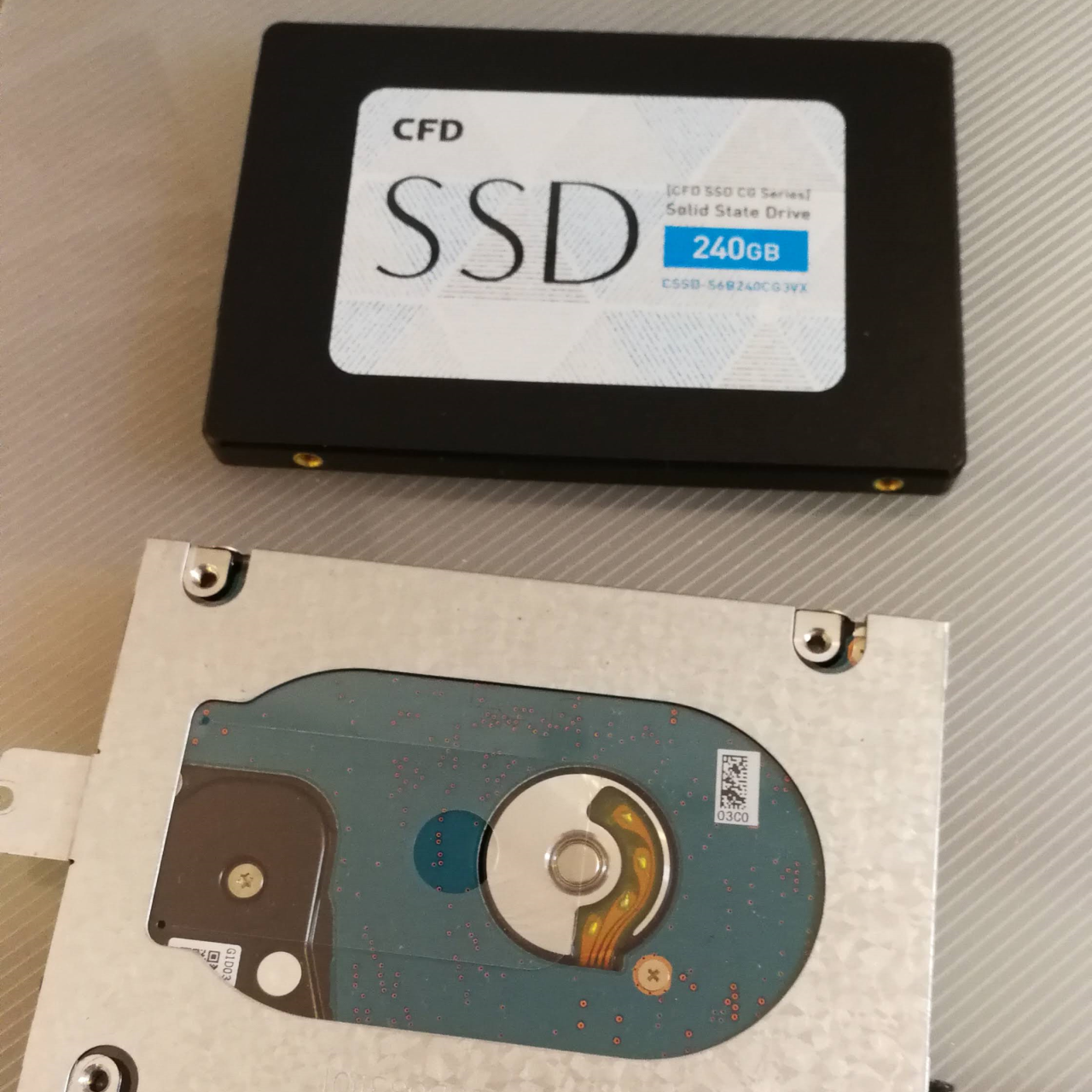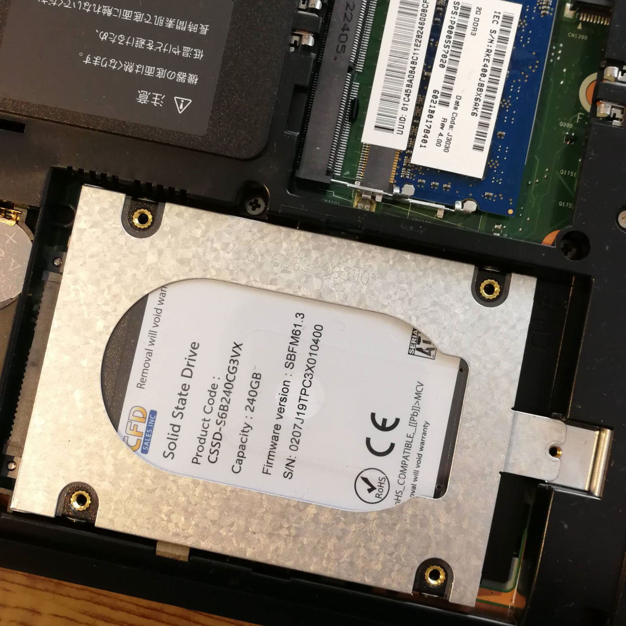 アルミケースを開けて、中のHDDを取り出し、SSDをケースに入れて再びPCに戻してあげれば交換終了。