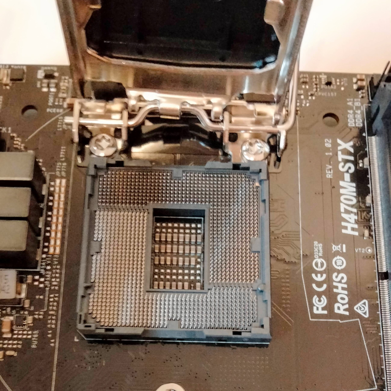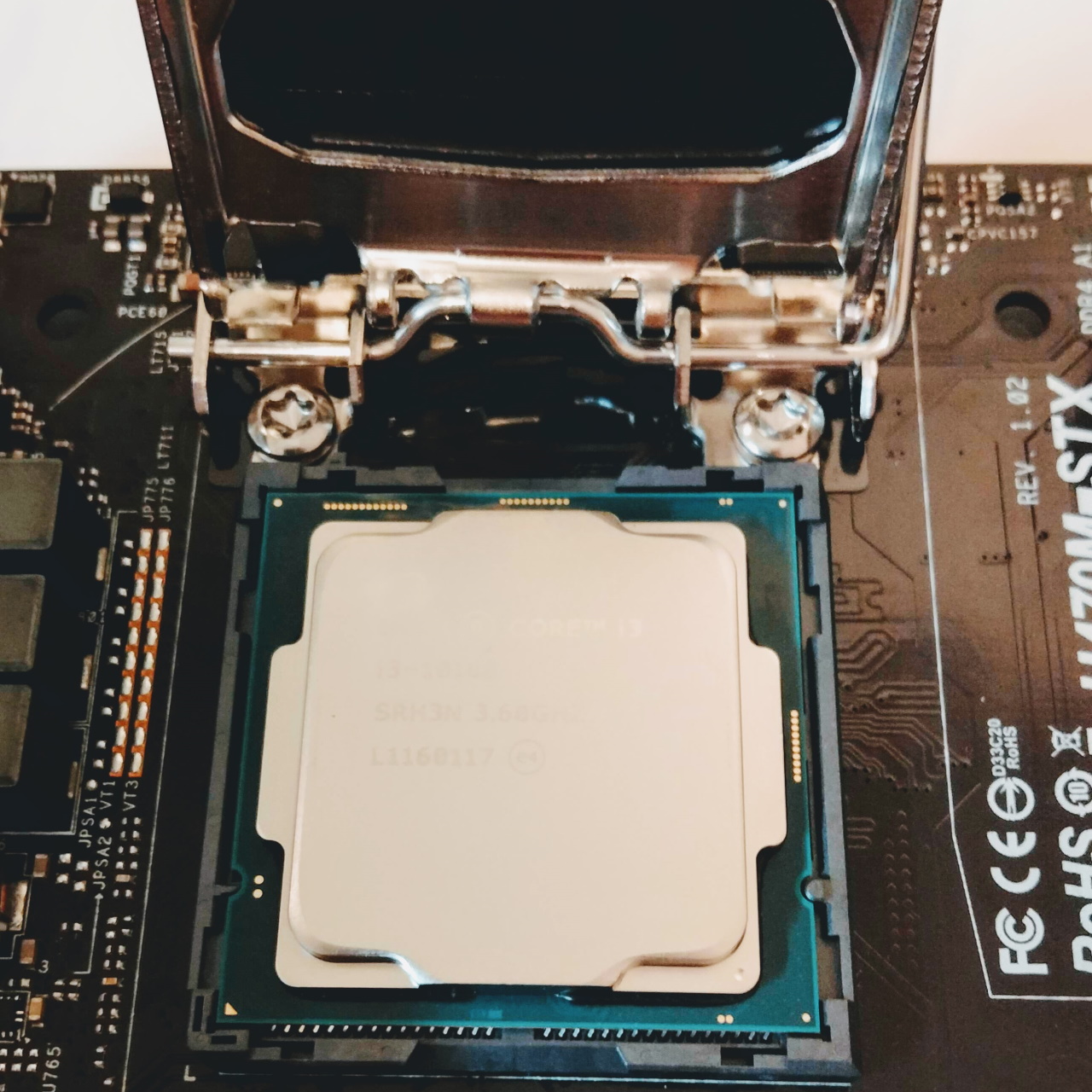 CPUソケットにIntel Core i3-10100を換装。ピンを折らないよう緊張の一瞬です。