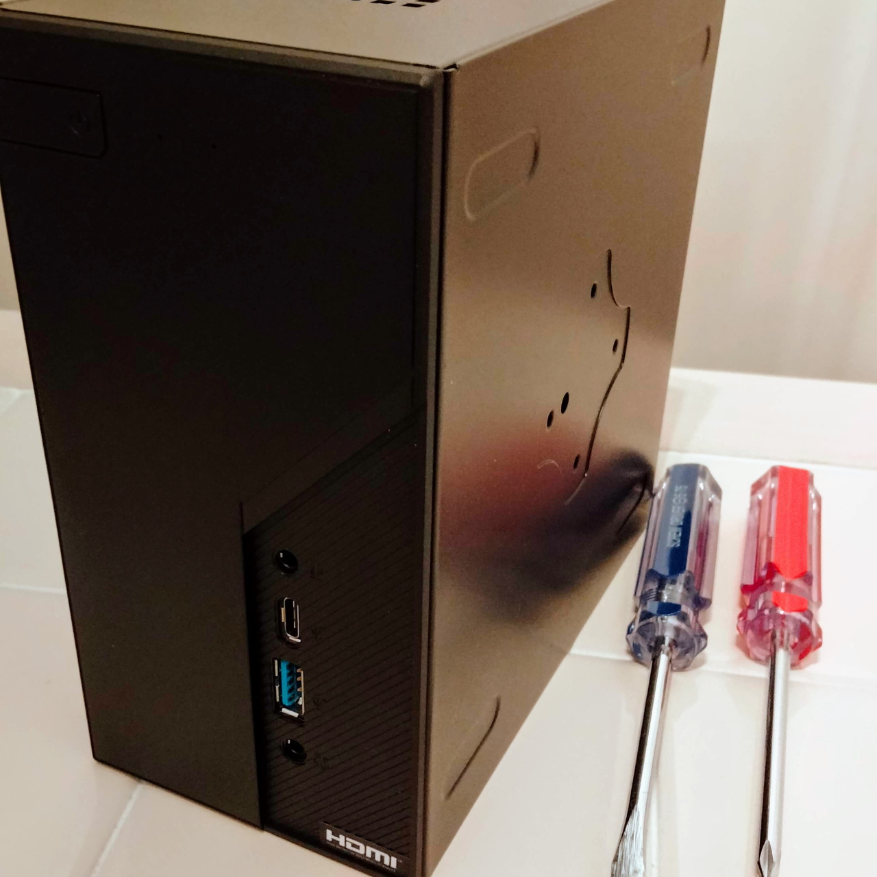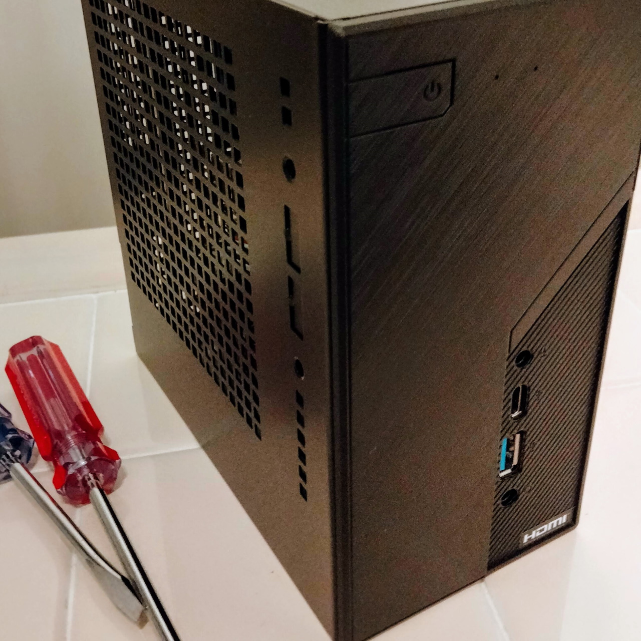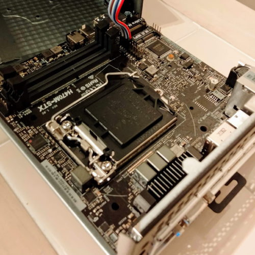 ベアボーンキットと呼ばれるこのケースはマザーボードが最初から組まれていて、CPUやメモリ、SSDなど好みの部品を組み合わせて取り付けるだけの、初心者でも比較的簡単に組むことが出来るパソコンです